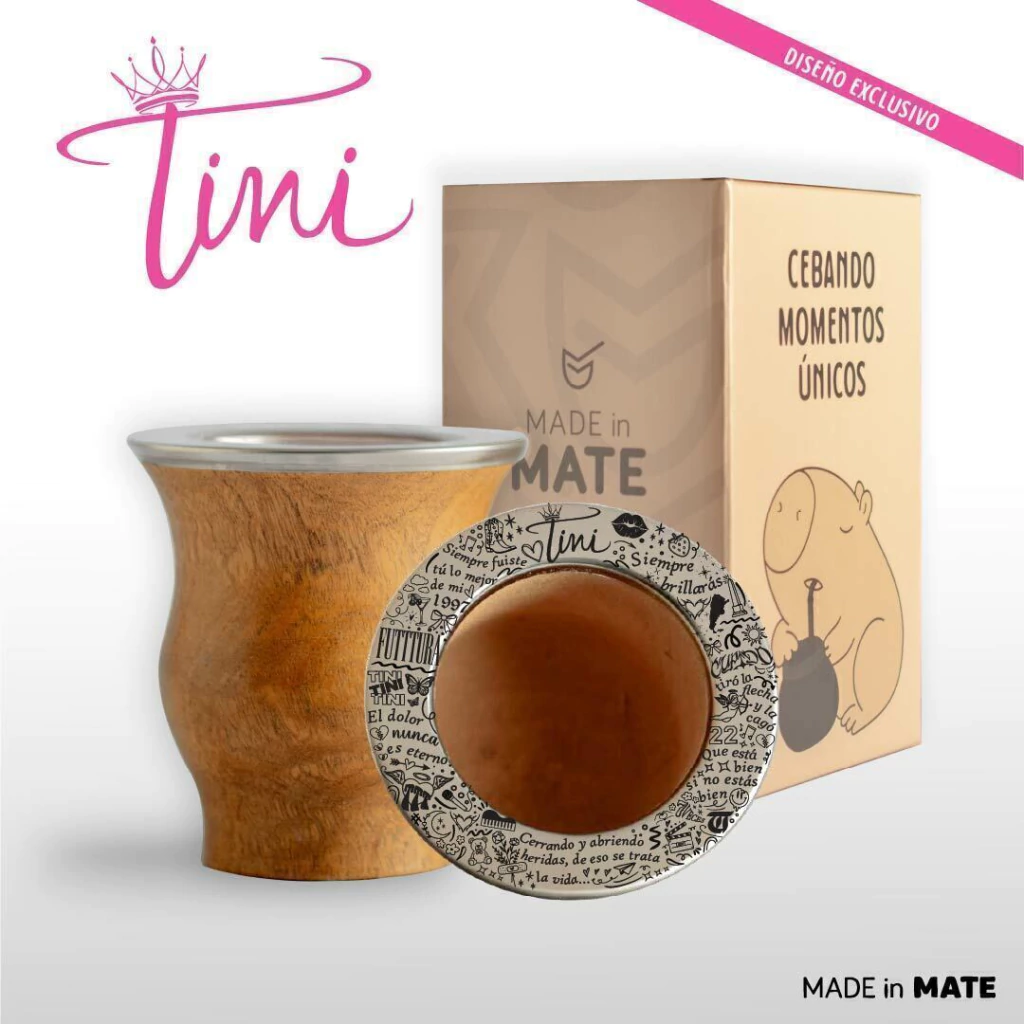 Mate camionero de algarrobo, es un mate mediano, ideal para todos los dias con virola de acero personalizada con una edicion exclusiva de TINI.