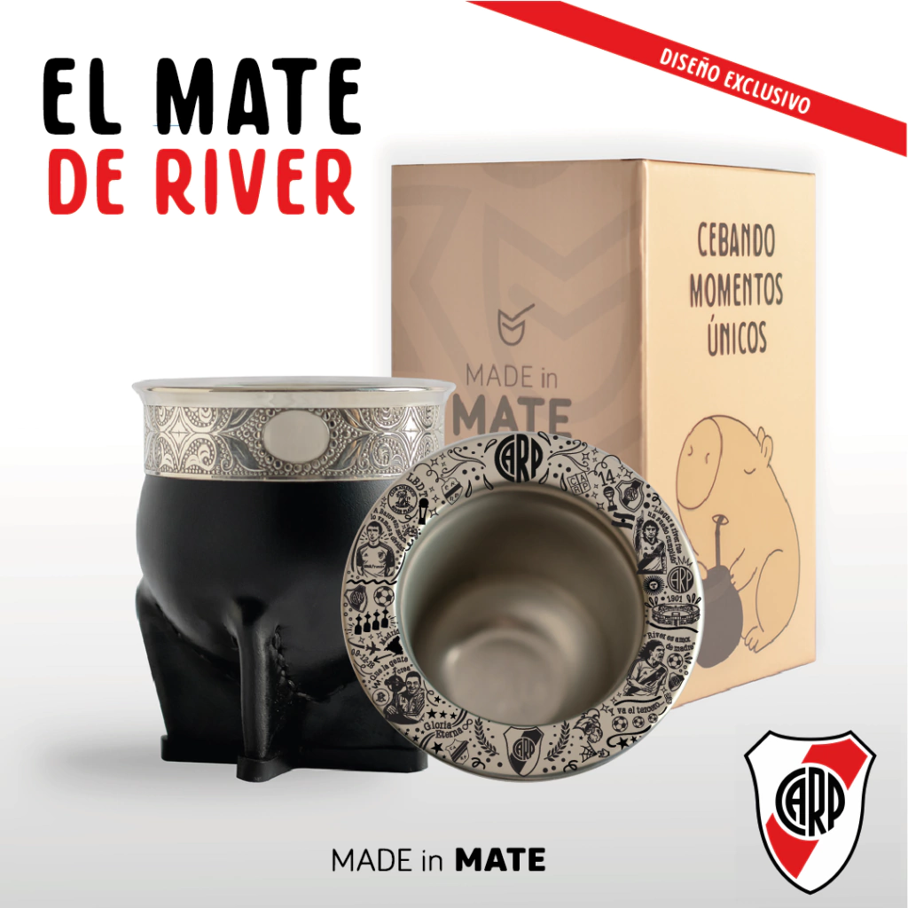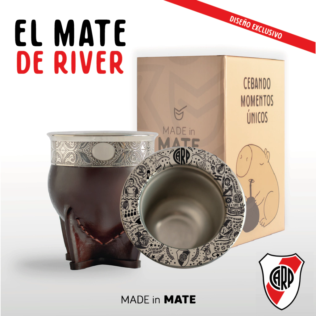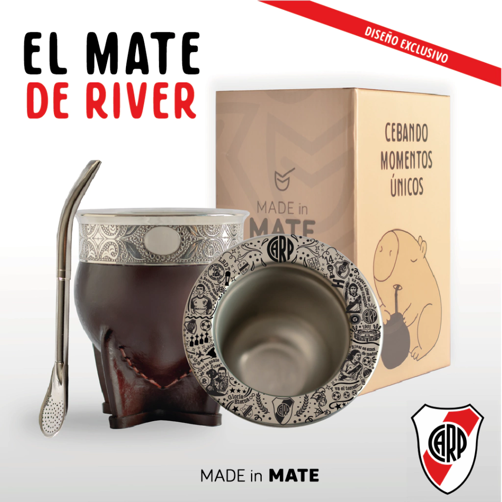 Mate imperial de acero, con guarda (sujeta a stock) y con virola de acero personalizada con una edicion exclusiva del Club Atletico River Plate.